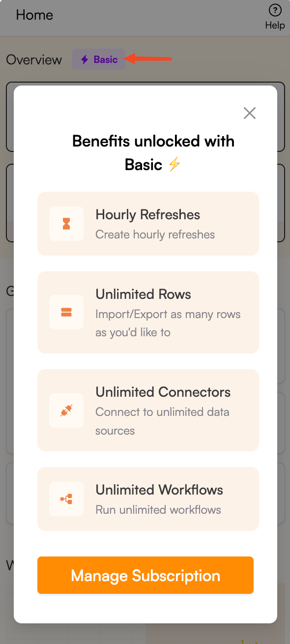 Click the purple button on the top of the screen that shows your current plan and click on “Manage Subscription” button.