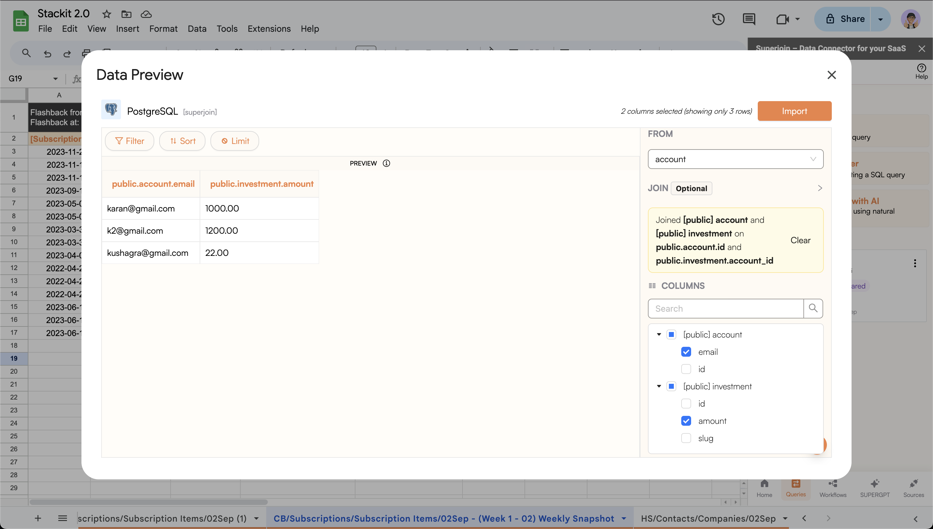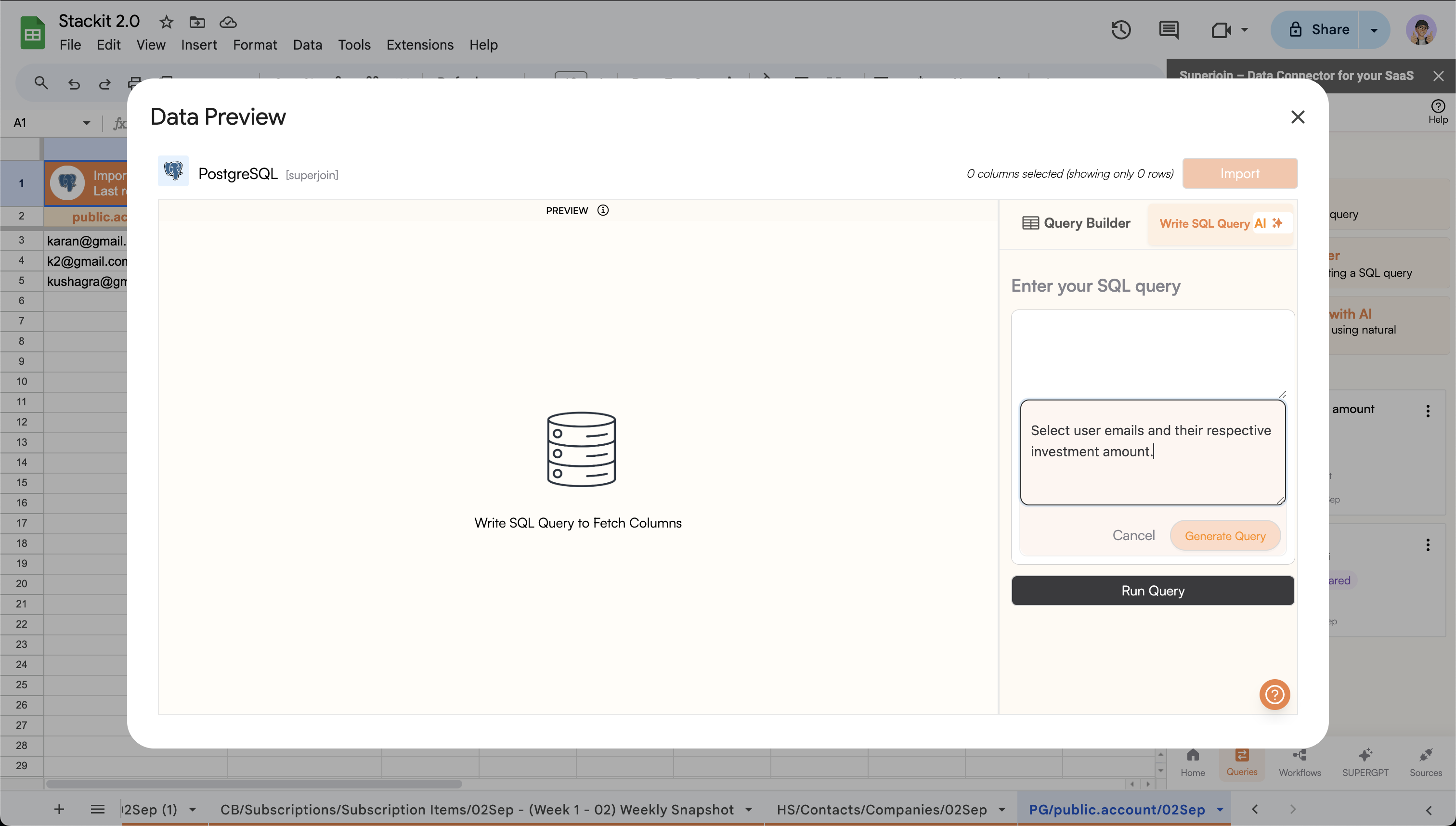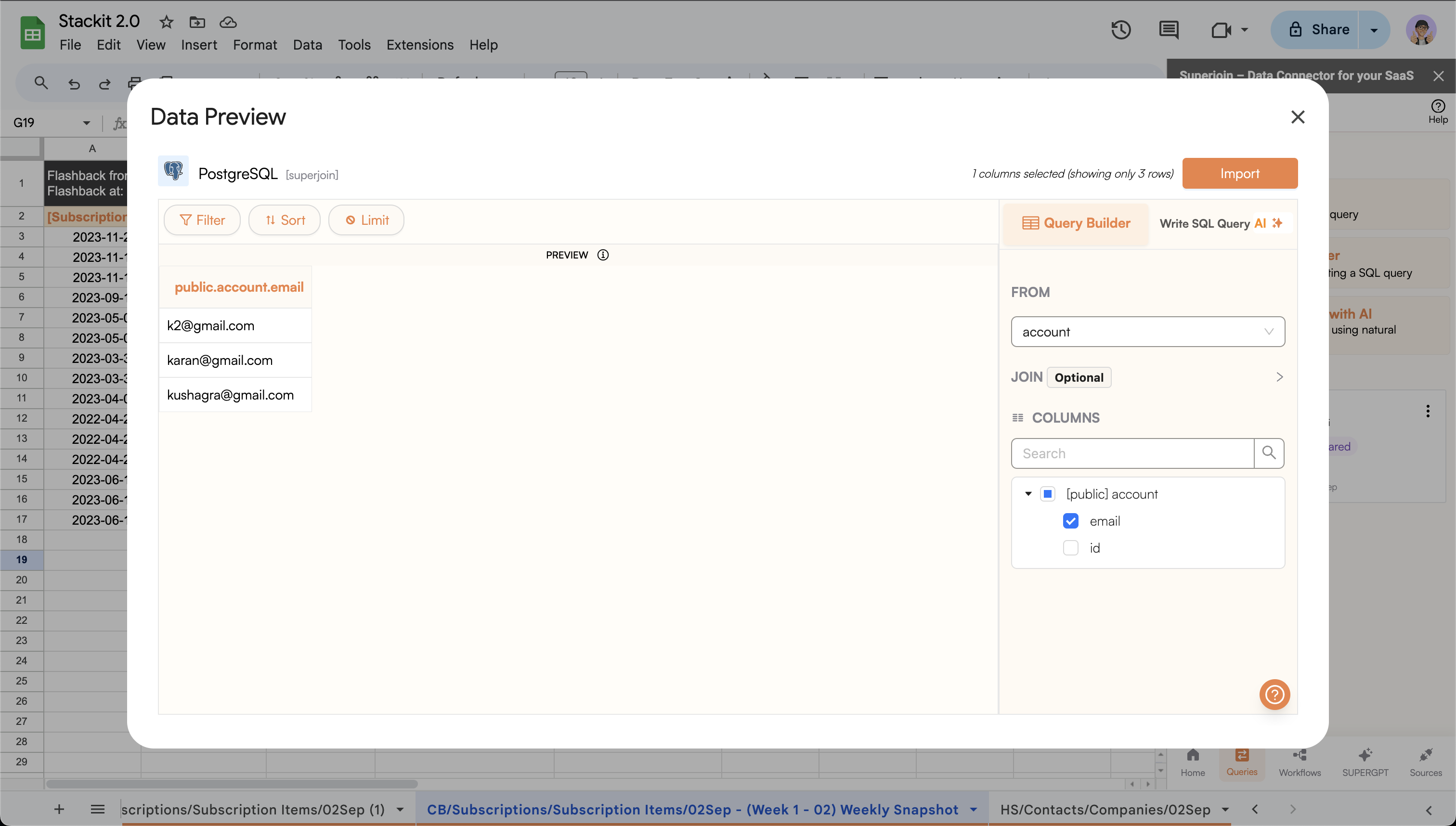 to use the visual SQL builder. - Select a table and its desired columns to import.