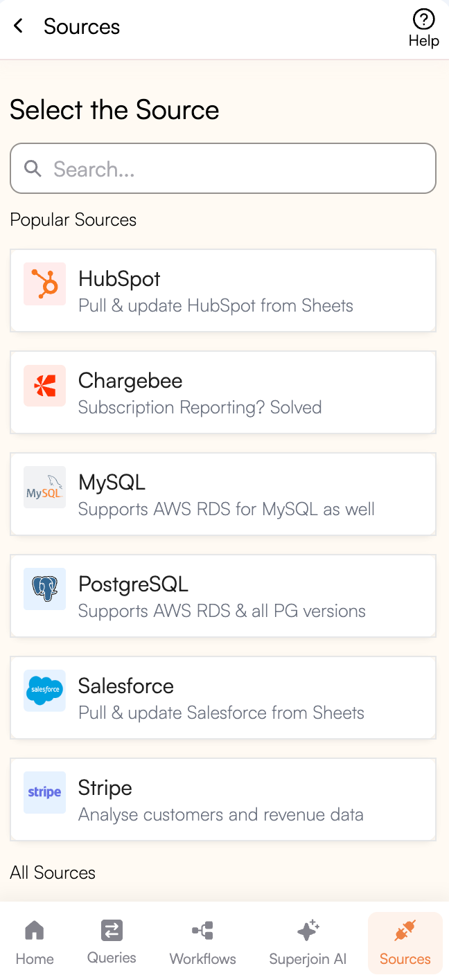 Once you connect a Source to Superjoin, it will be available for you in the “Your Sources” tab to use in any of your Google Sheets.