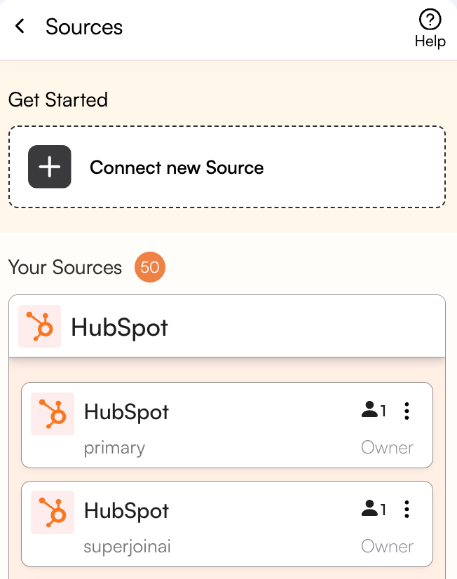 Sources a.k.a Connections a.k.a Intergrations are the different platforms or SaaS tools from where you want to bring your data. For example, HubSpot is a data source - you can bring specific data from HubSpot to Google Sheets using Superjoin.