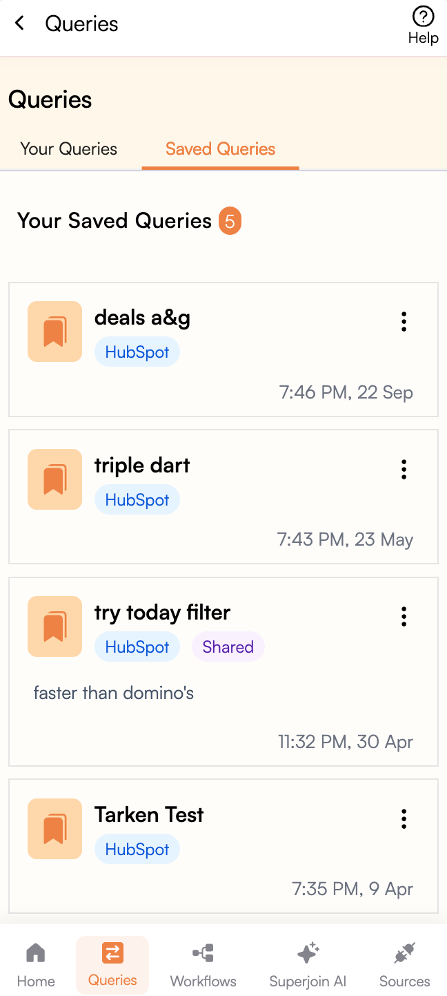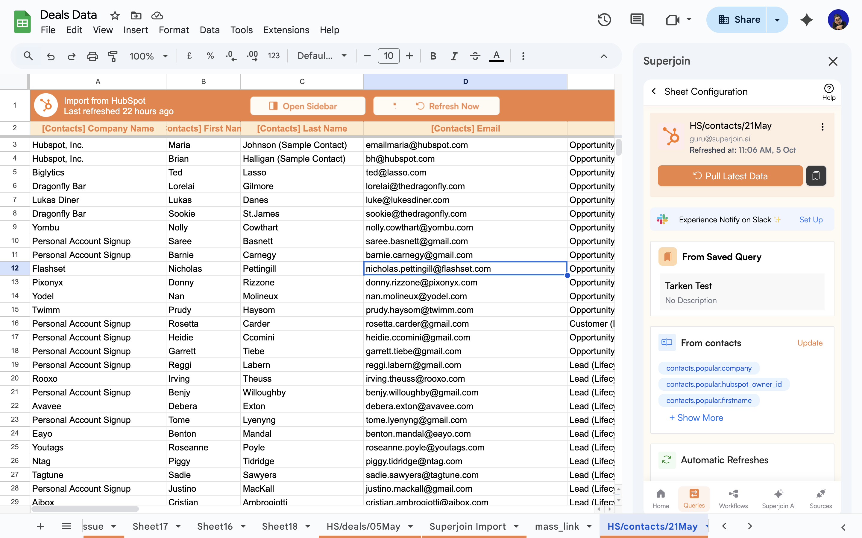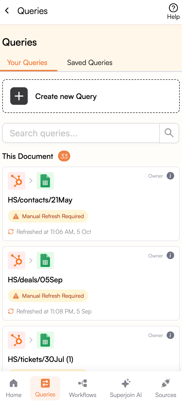 Queries are the data operations that you want to do/have done. You can either import data from various Sources into Google Sheets or export data from Google Sheets to HubSpot or Salesforce. You need to create queries to perform any data movement action between Superjoin and your Sources. Every data movement action that you do gets recorded in the queries section so that you can come back to it anytime you like and give it a refresh. Each query is tied to a sheet within your spreadsheet document.