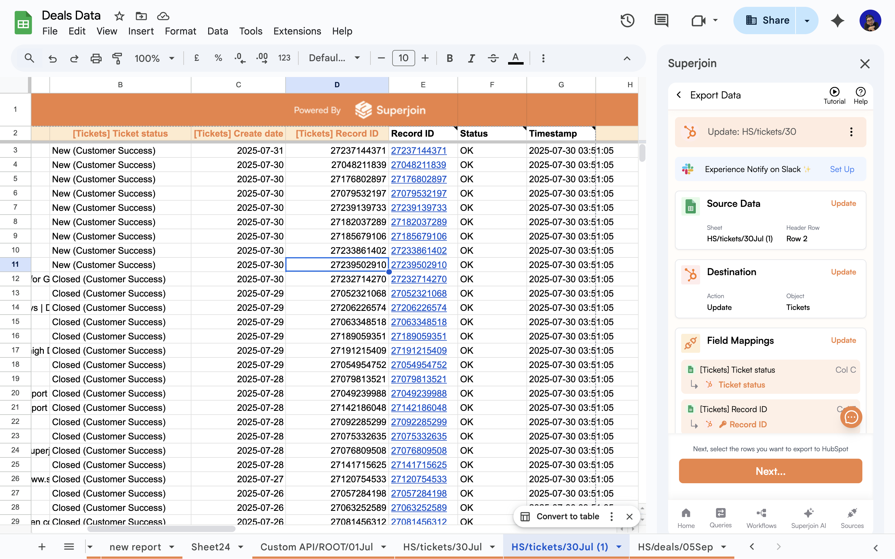 Exports are the data operations where you send data from Google Sheets to your Sources. For example, you can export Contacts from Google Sheets into HubSpot using Superjoin.