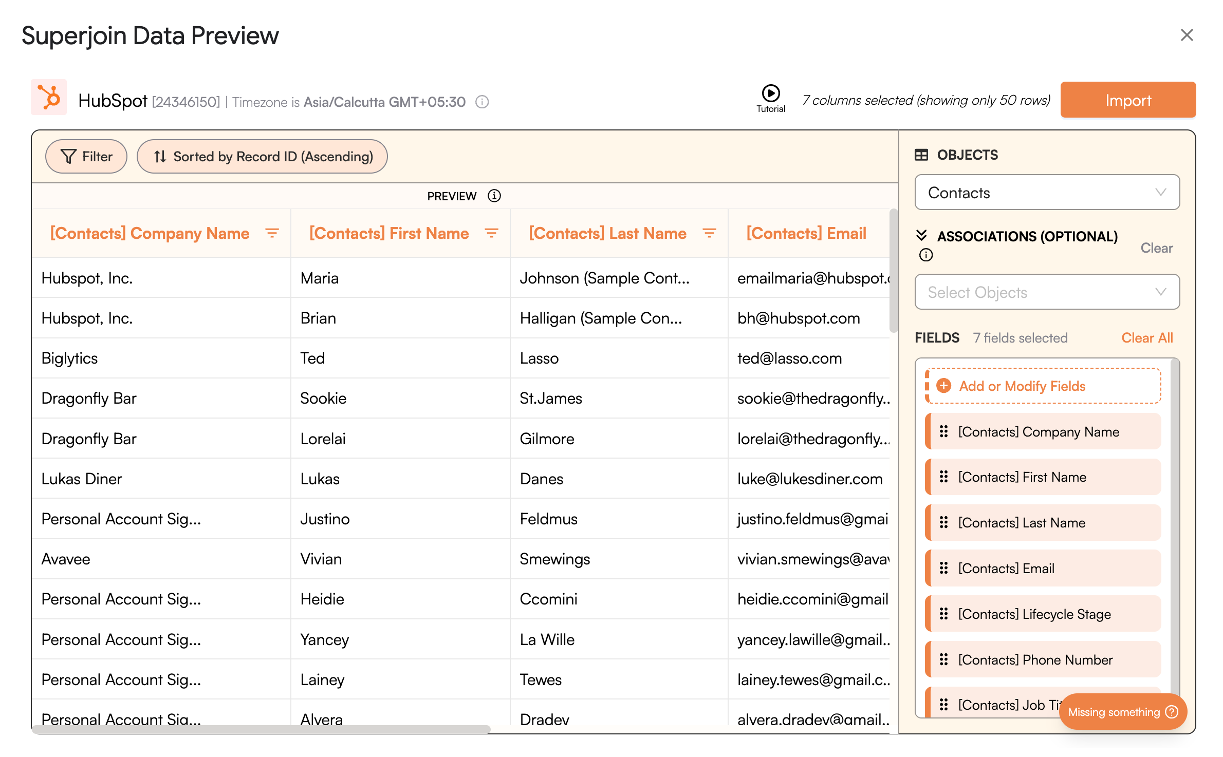 Imports are the data operations where you bring data from your Sources into Google Sheets. For example, you can import Contacts from HubSpot into Google Sheets using Superjoin.