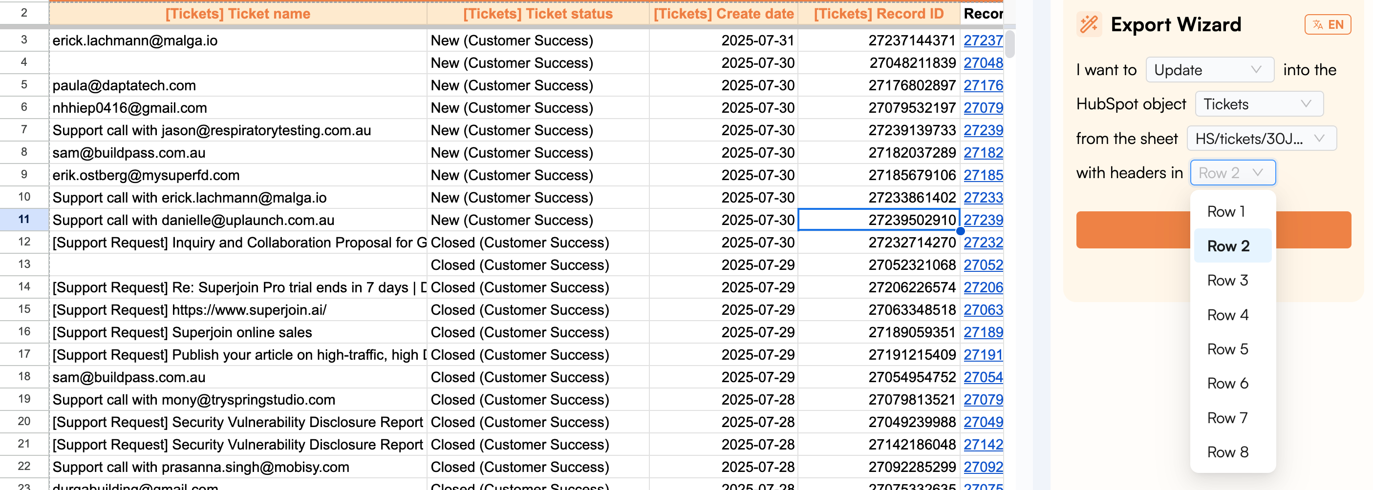 The Header Row is the row in your Google Sheet which contains the column names. Superjoin uses this row to help you map the columns in your Google Sheets to the fields/properties in your Source (HubSpot or Salesforce).