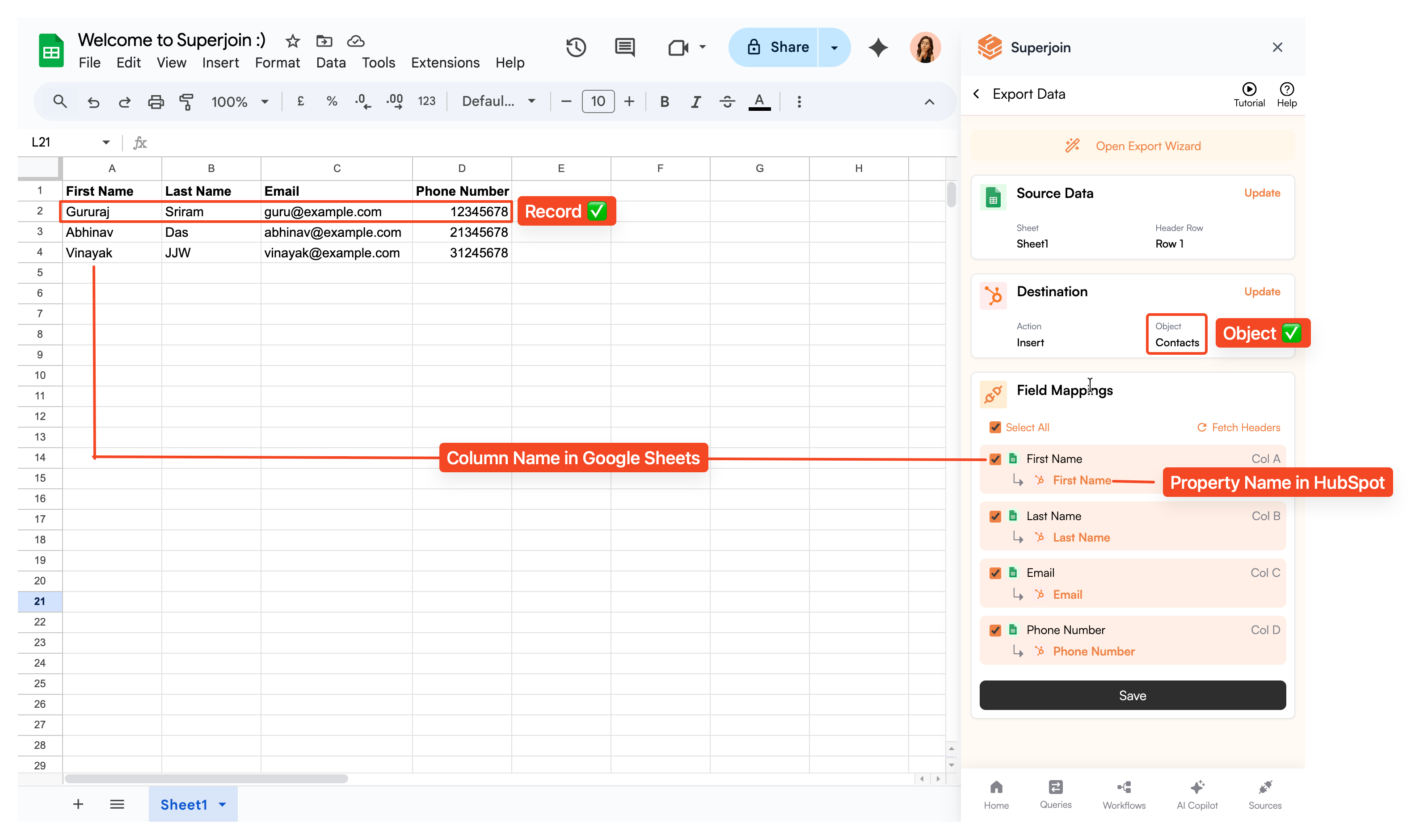 Here is the visual representation of HubSpot’s data model in Superjoin when importing data from HubSpot to Google Sheets.