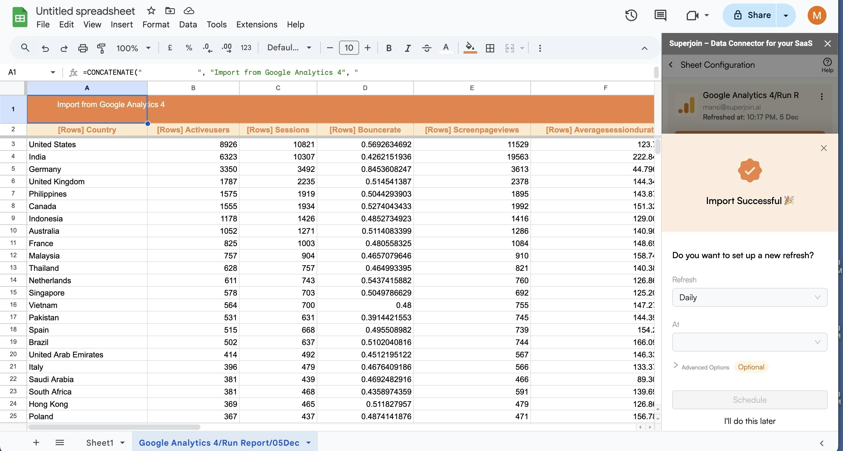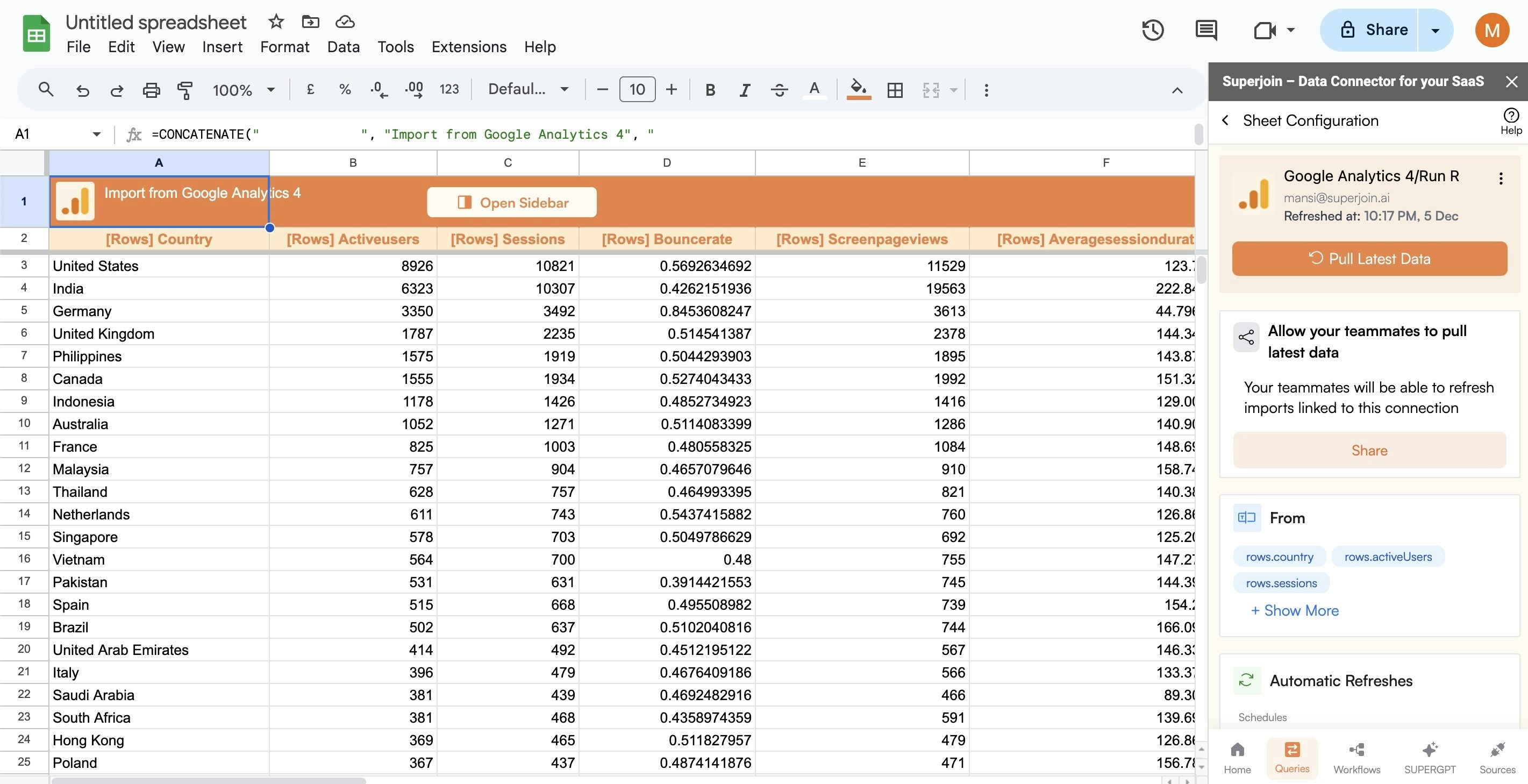 Superjoin lets you refresh your imported data instantly with one click or set it to auto-refresh on a pre-set schedule. This way, you won’t need to manually update your Google Analytics data in Google Sheets to reflect changes from the source.