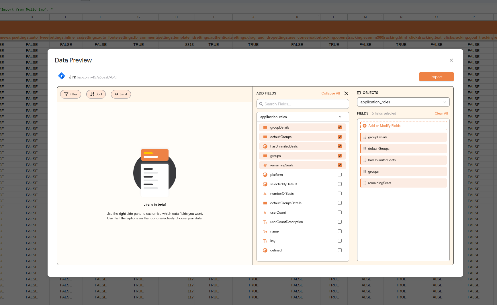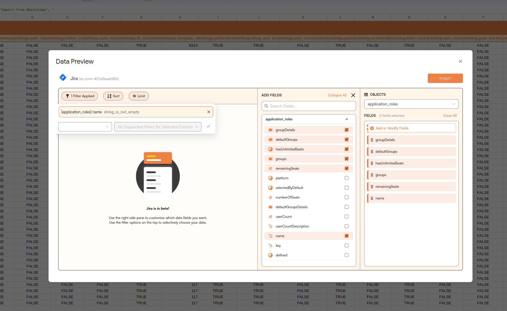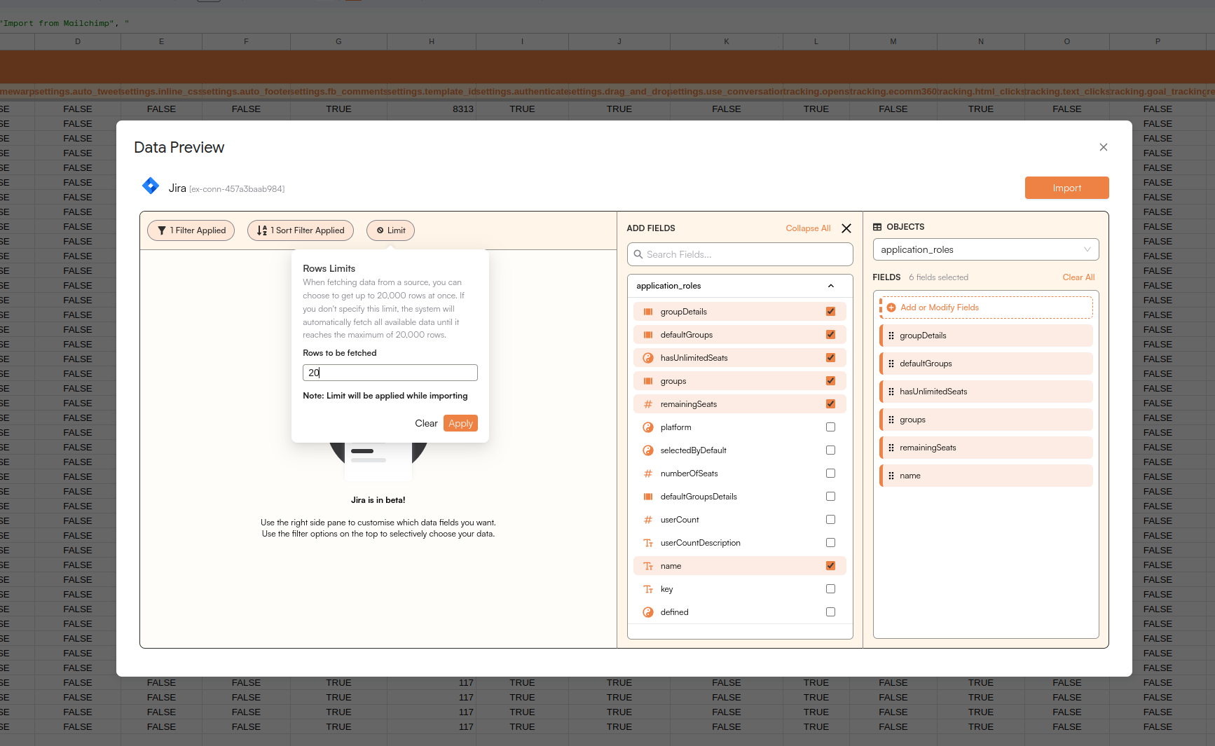 Get a sneak peek of your data. Select columns, apply filters & limits as per your need before importing.