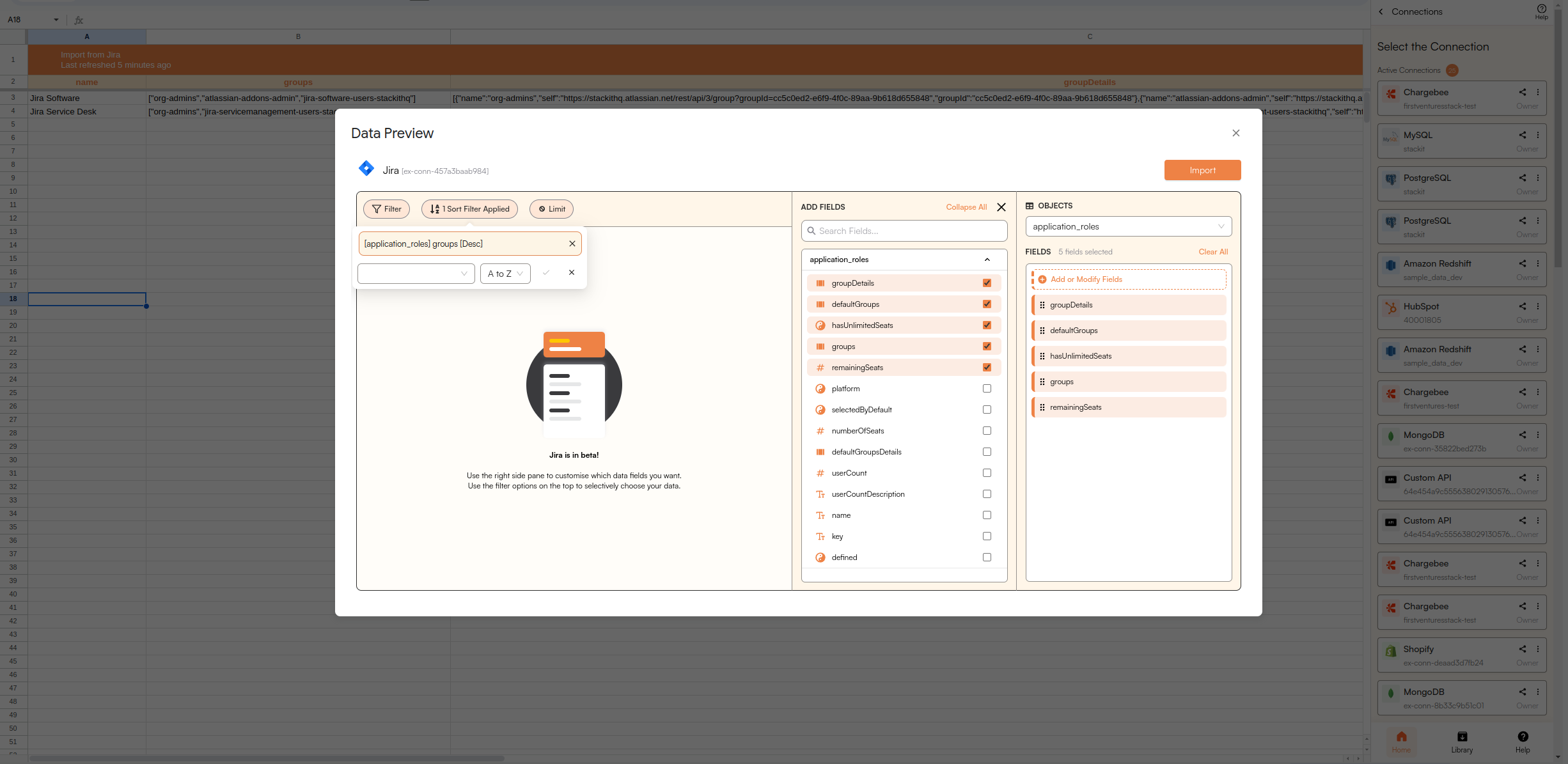 Connect your Jira account. Go through all the directions and prompts to connect your Jira account to Google Sheets.