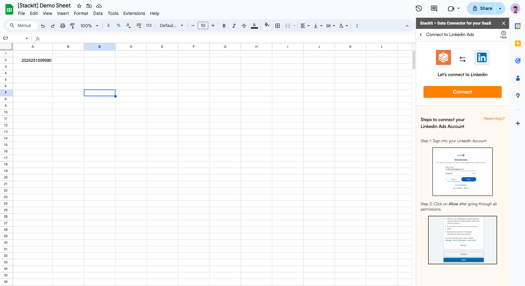 Connect your Linkedin Ads account. Go through all the directions and prompts to connect your Linkedin Ads account to Google Sheets.