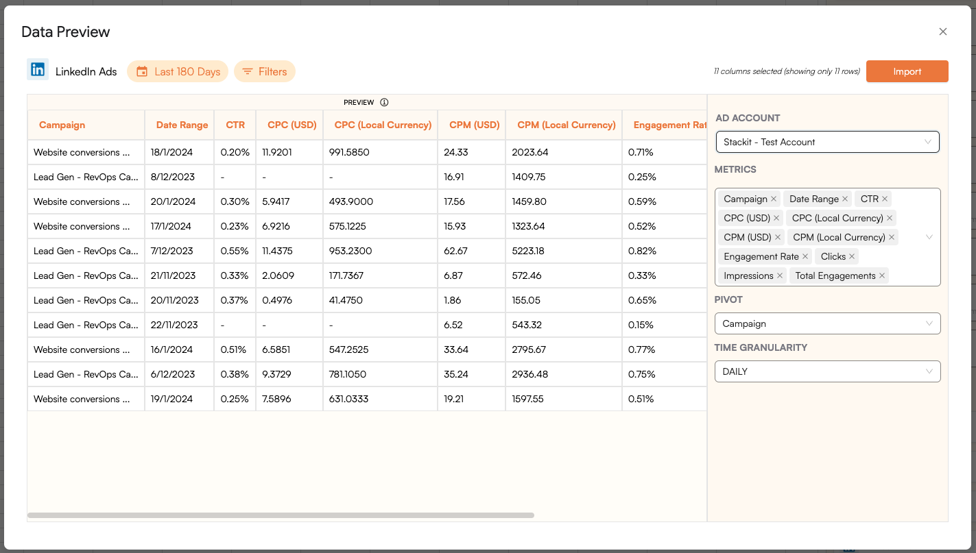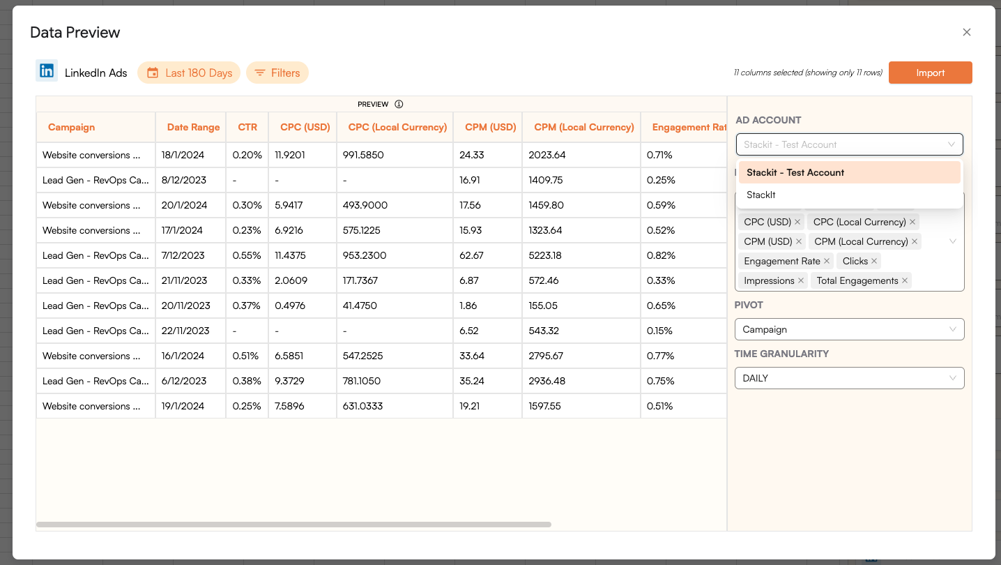 Now select the Ad Account along with the metrics and pivots that you wish to apply to bring into Google Sheets.