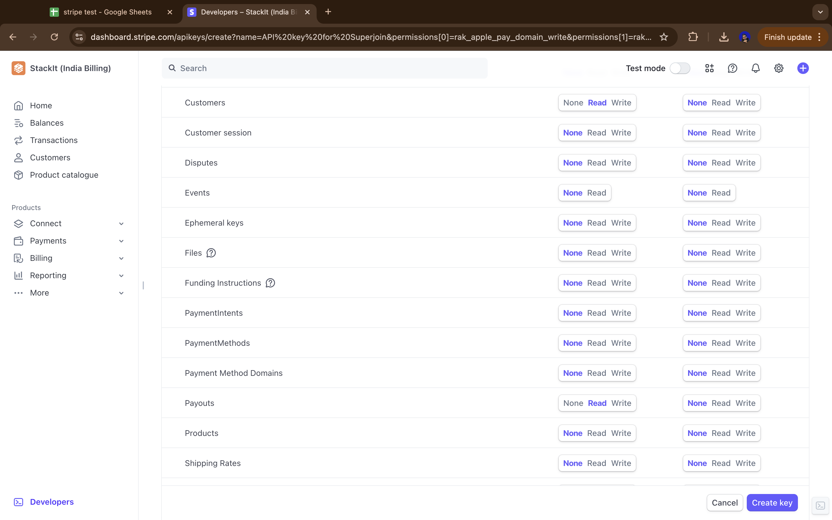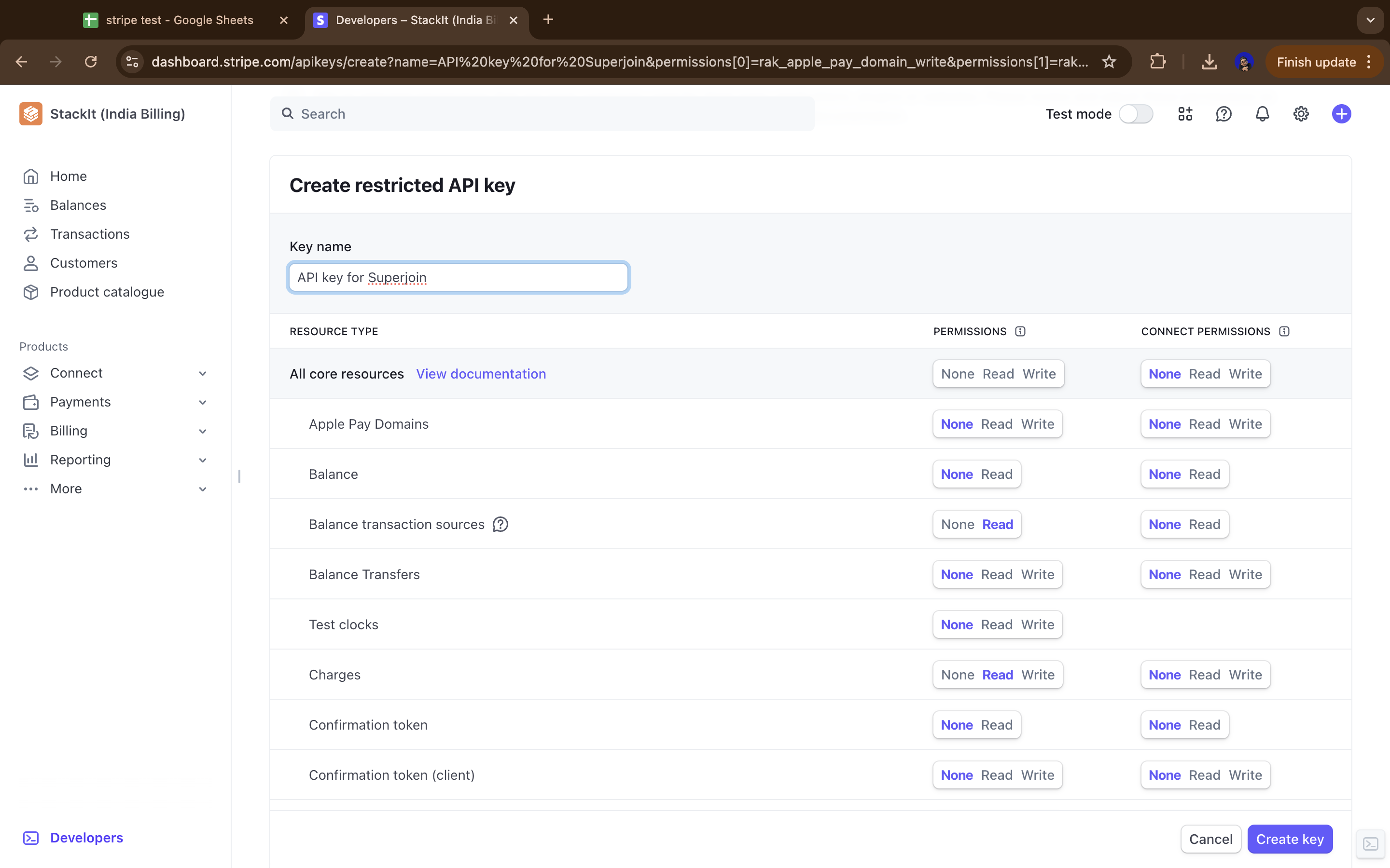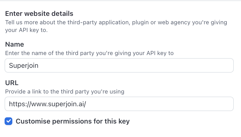 Enter Superjoin’s details and check the “Customise permissions for this key” checkbox and click on “Create Restricted Key”.