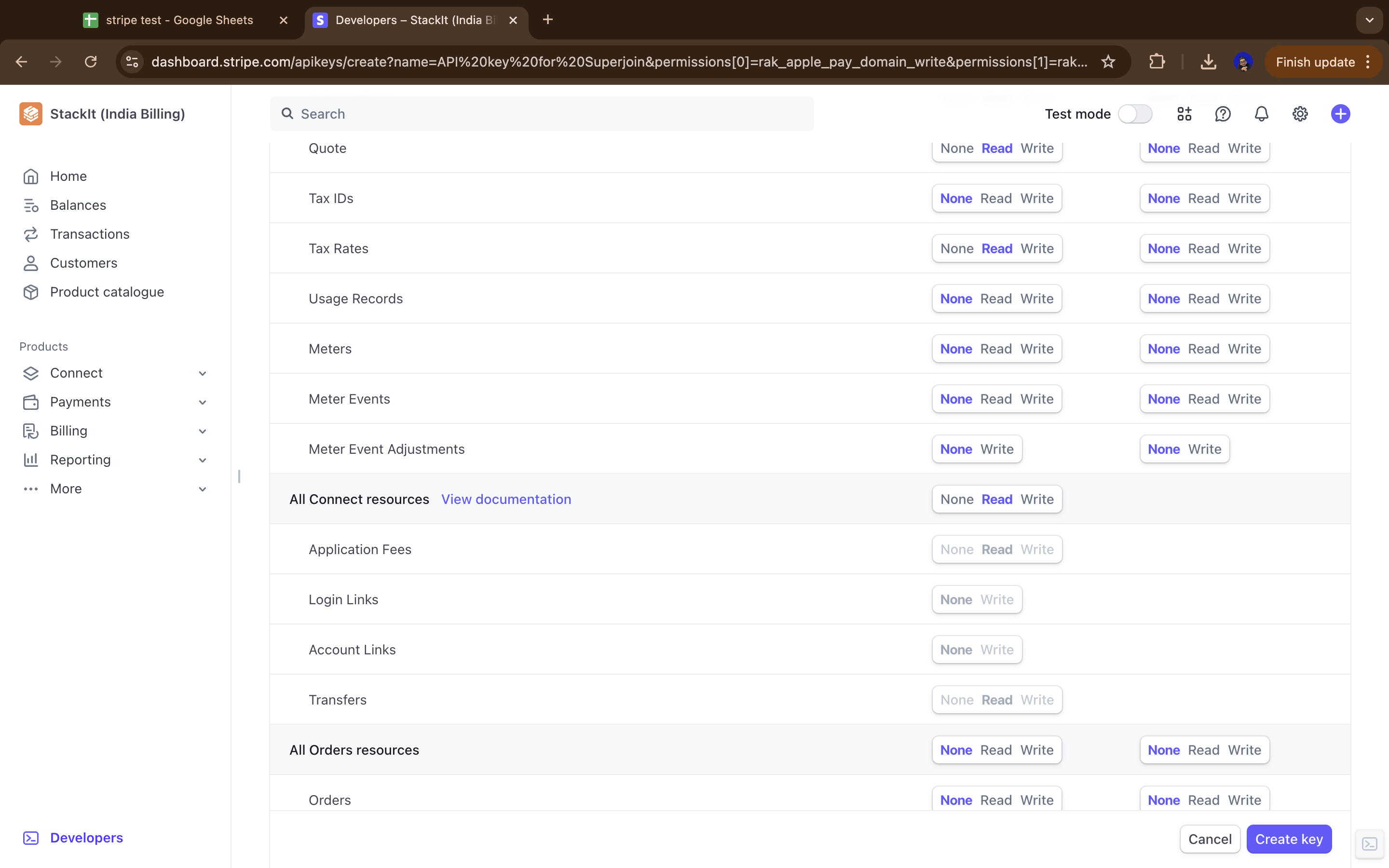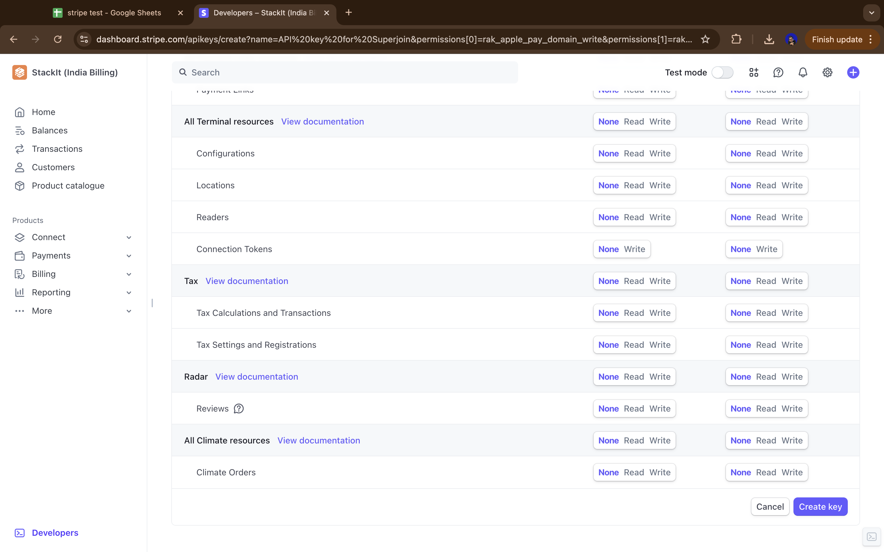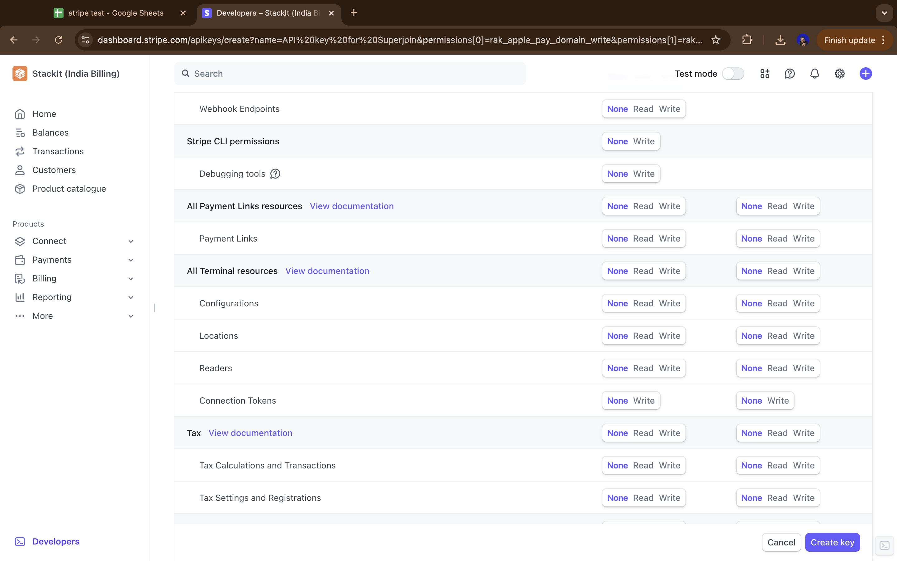 Enter Superjoin’s details and check the “Customise permissions for this key” checkbox and click on “Create Restricted Key”.