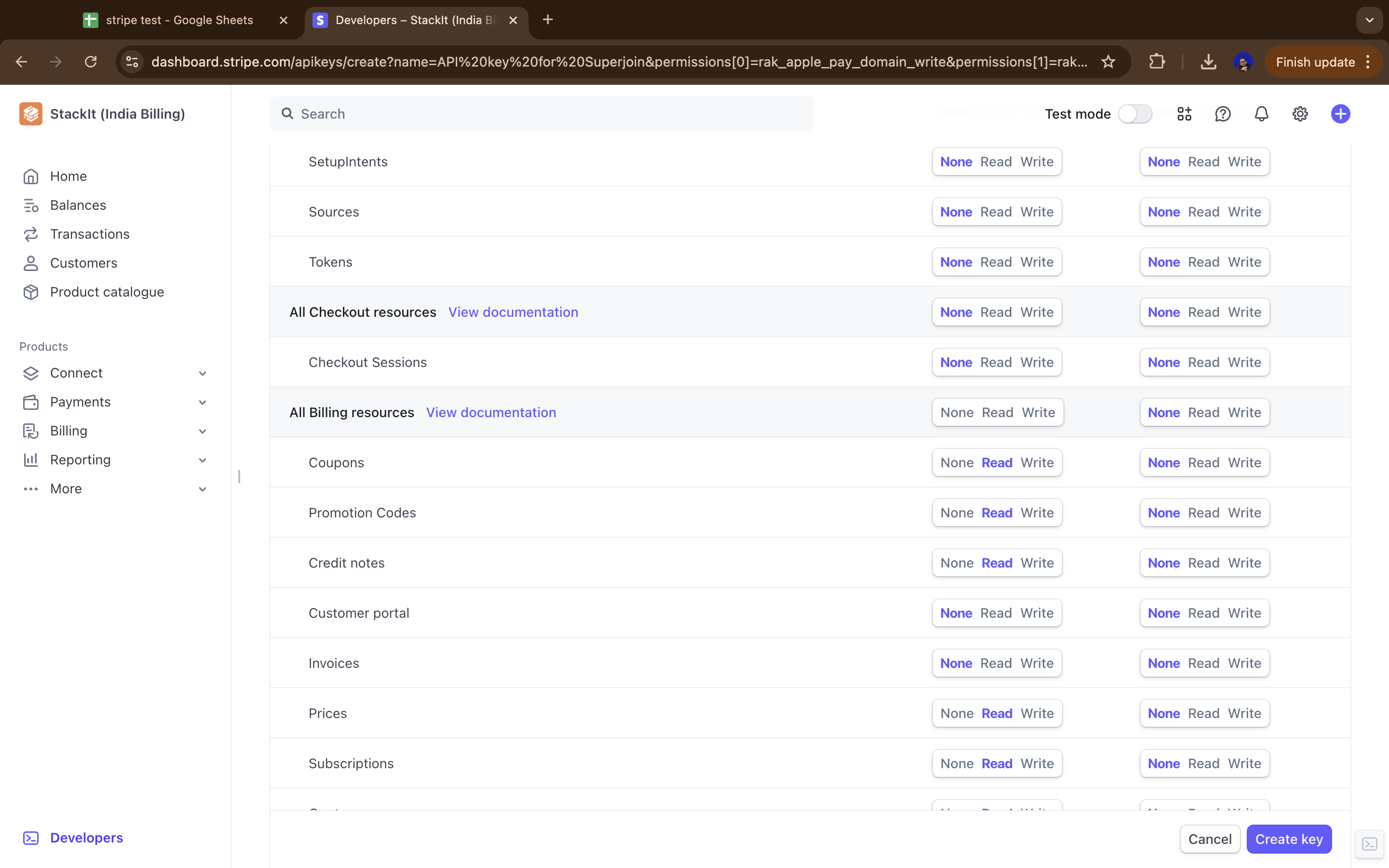 Below is a comprehensive table of suggested permissions for your Stripe Restricted API key. You can adjust these based on what specific data you want to access through Superjoin.Note: Most resources are set to “Read” permission to allow accessing data while maintaining security by not allowing write operations. Resources marked as “None” are typically not needed for data integration purposes.