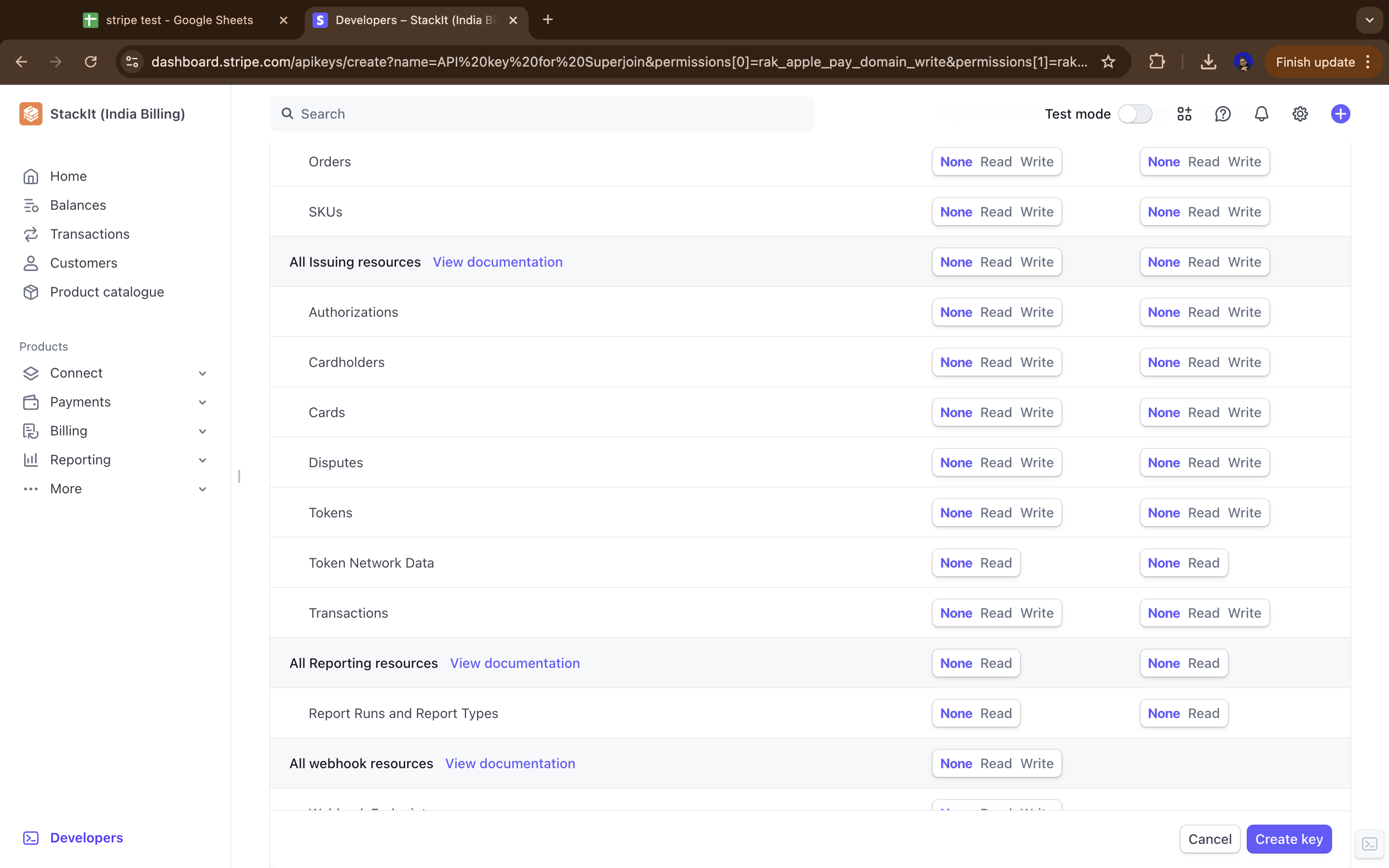 The permissions table above provides a suggested configuration that works well for most Superjoin integrations with Stripe. You can modify these permissions based on what specific data you want to access through your integration. In general, Read-only permissions are safest and sufficient for data integration purposes.
