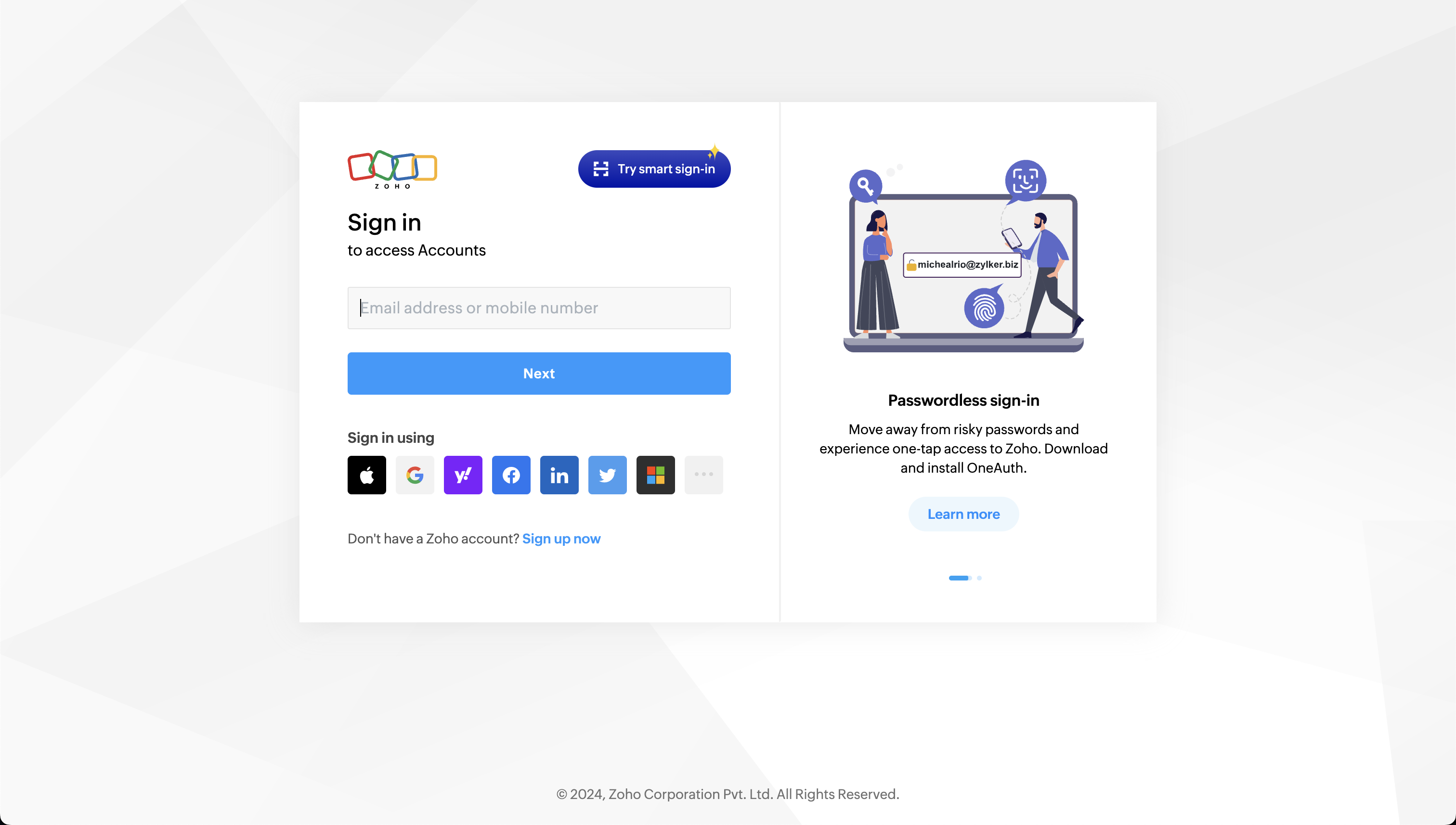 - Sign-in to your Zoho CRM account using credentials or other providers.