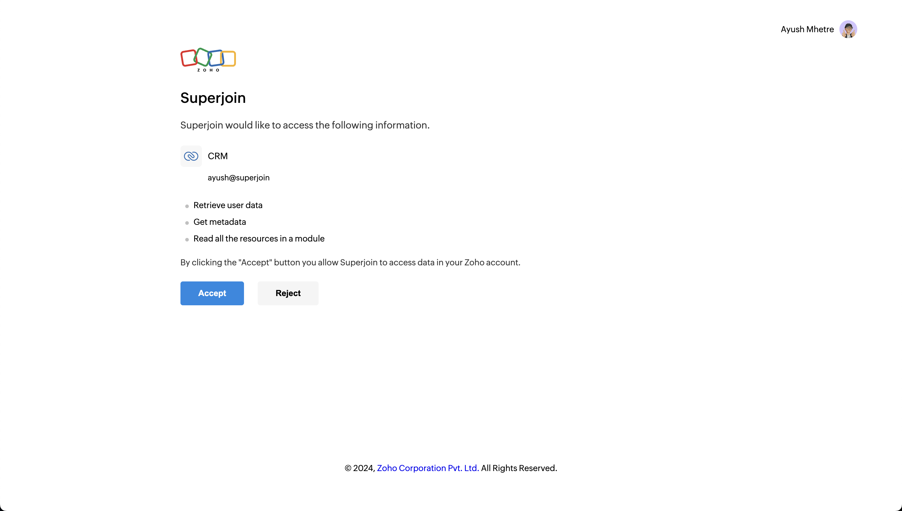 button to allow to allow Superjoin to access your Zoho CRM data.