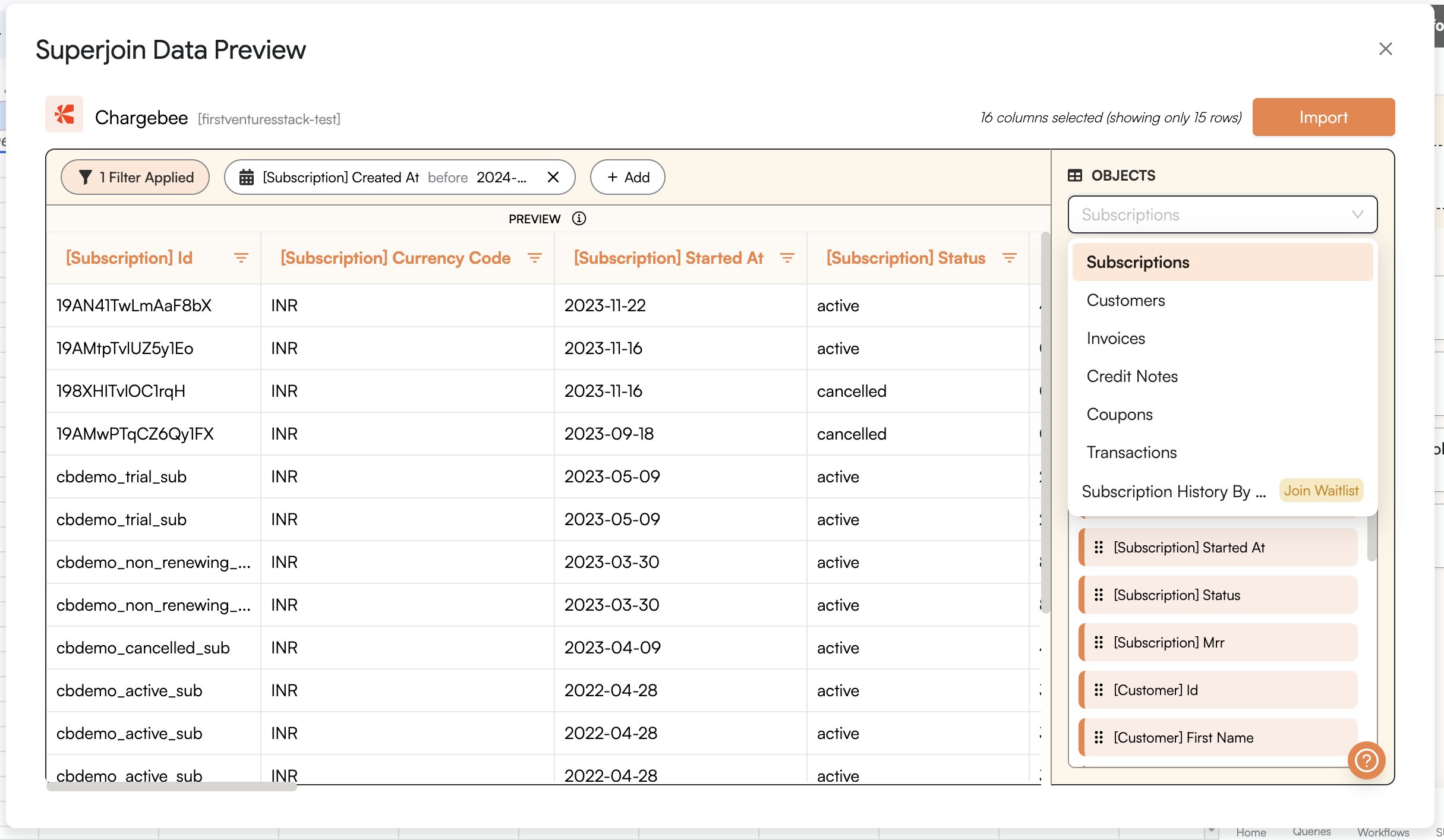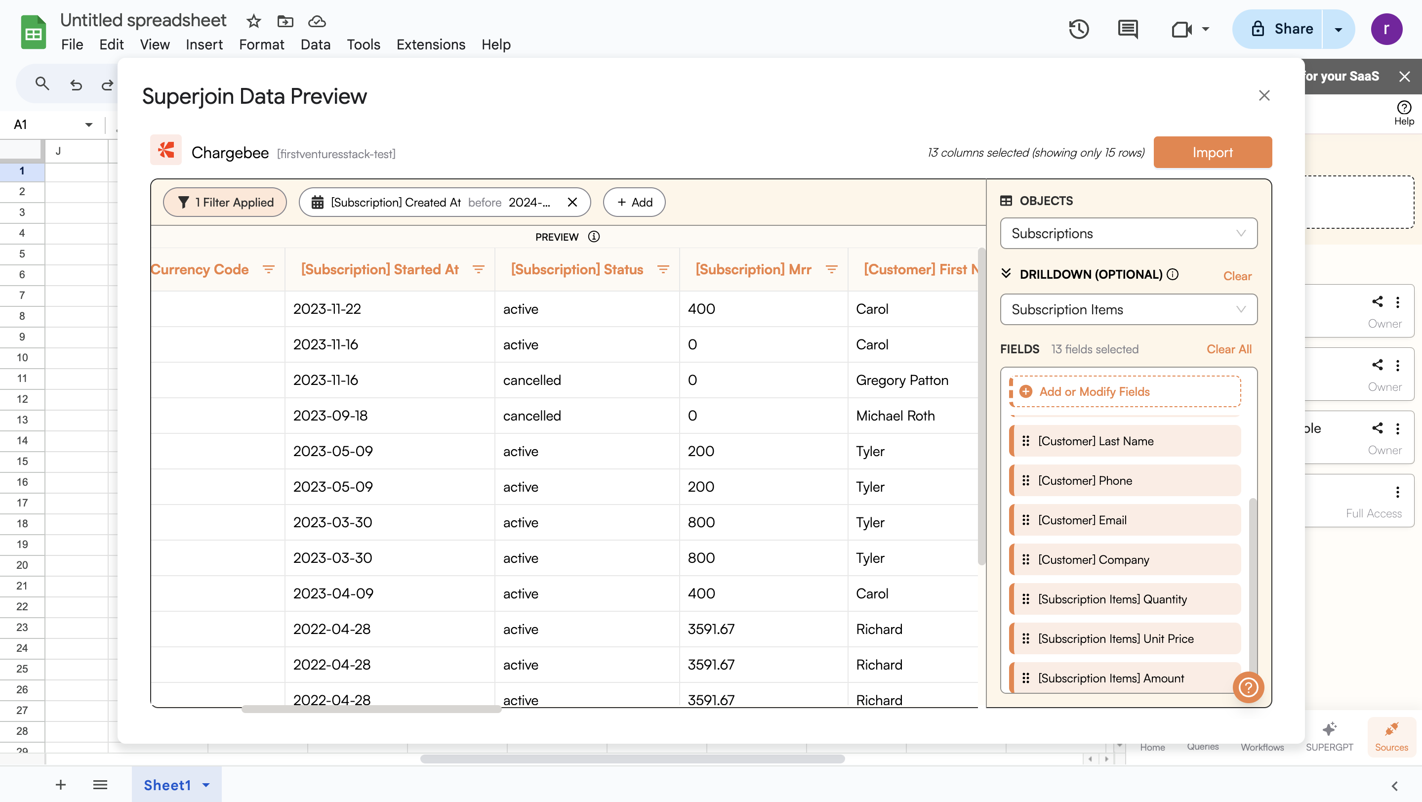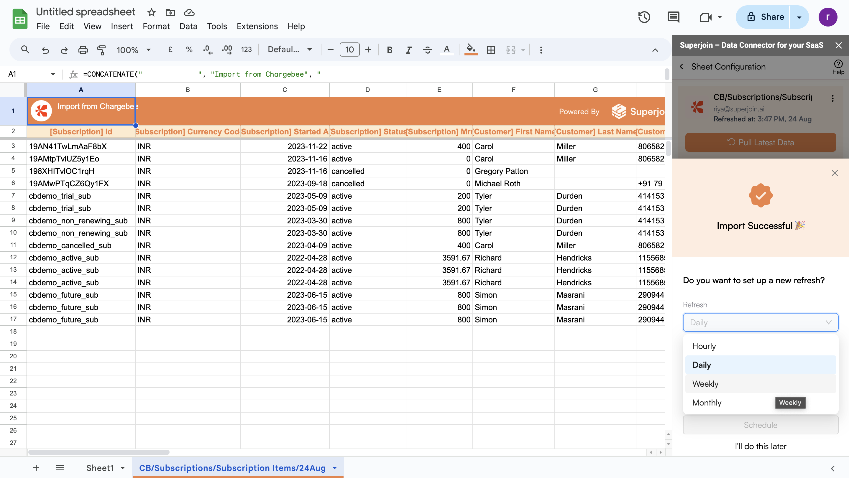 and wait for a few seconds. This action transfers all data from your Chargebee account into Google Sheets.