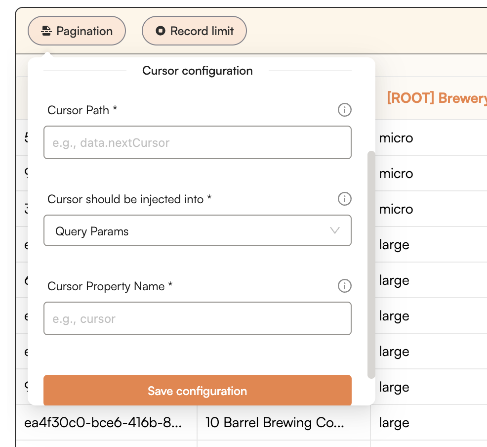 Injection Into | yes | Choose where to inject the cursor value in the API request. Options include placing it in the query parameters, headers, or body of the request. |