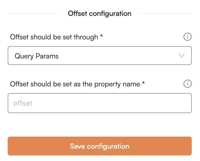 Offset should be set as the property name | yes | Define the exact parameter name that will carry the offset in your API request, such as offset, start, or skip. |