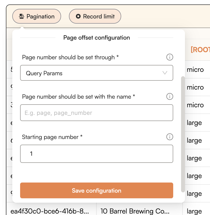 Page number should be set through | yes | Choose where the page number will be included in your API request. It can be placed in the query parameters, headers, or body of the request. |