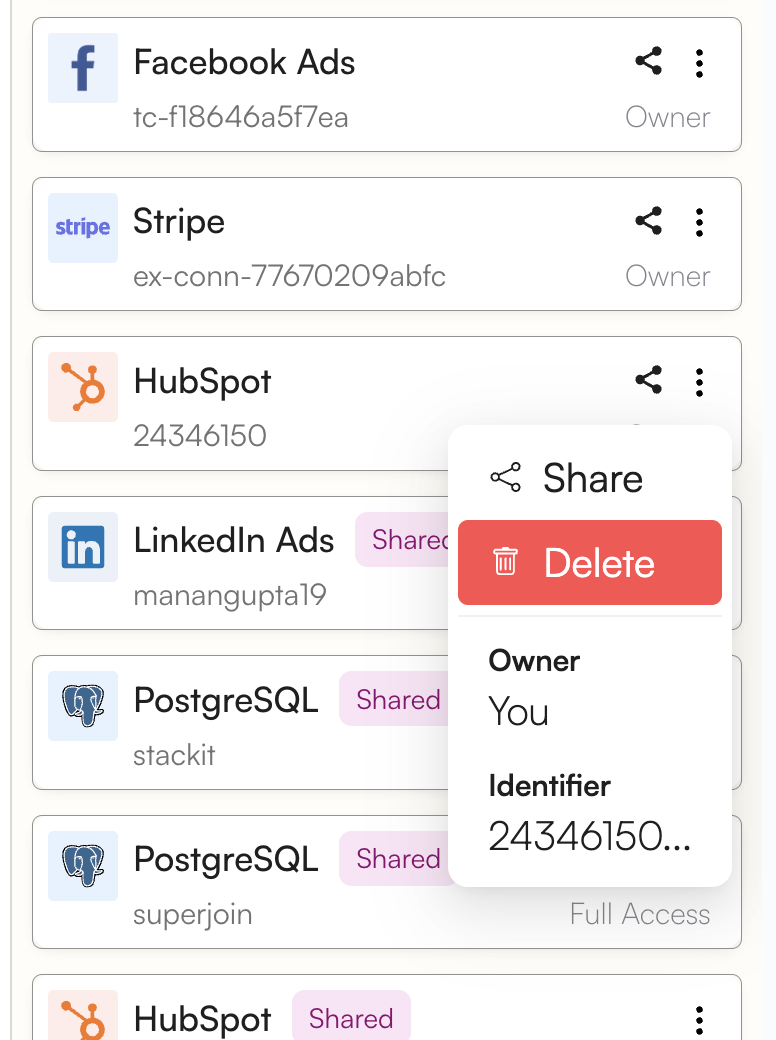 Click on the 3-dot menu of the HubSpot account you wish to delete. Click on Delete and confirm it.