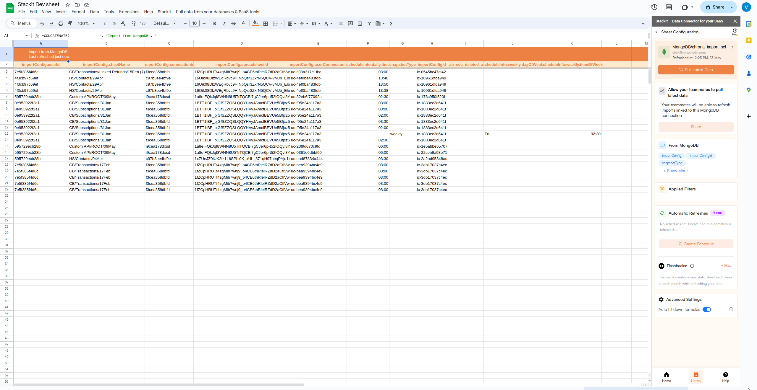 Superjoin lets you refresh your imported data instantly with one click or set it to auto-refresh on a pre-set schedule. This way, you won’t need to manually update your MongoDB data in Google Sheets to reflect changes from the source.