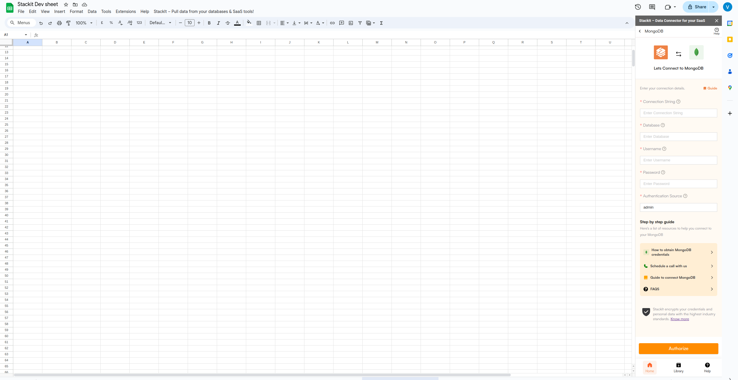 Connect your MongoDB account. Go through all the directions and prompts to connect your MongoDB account to Google Sheets.