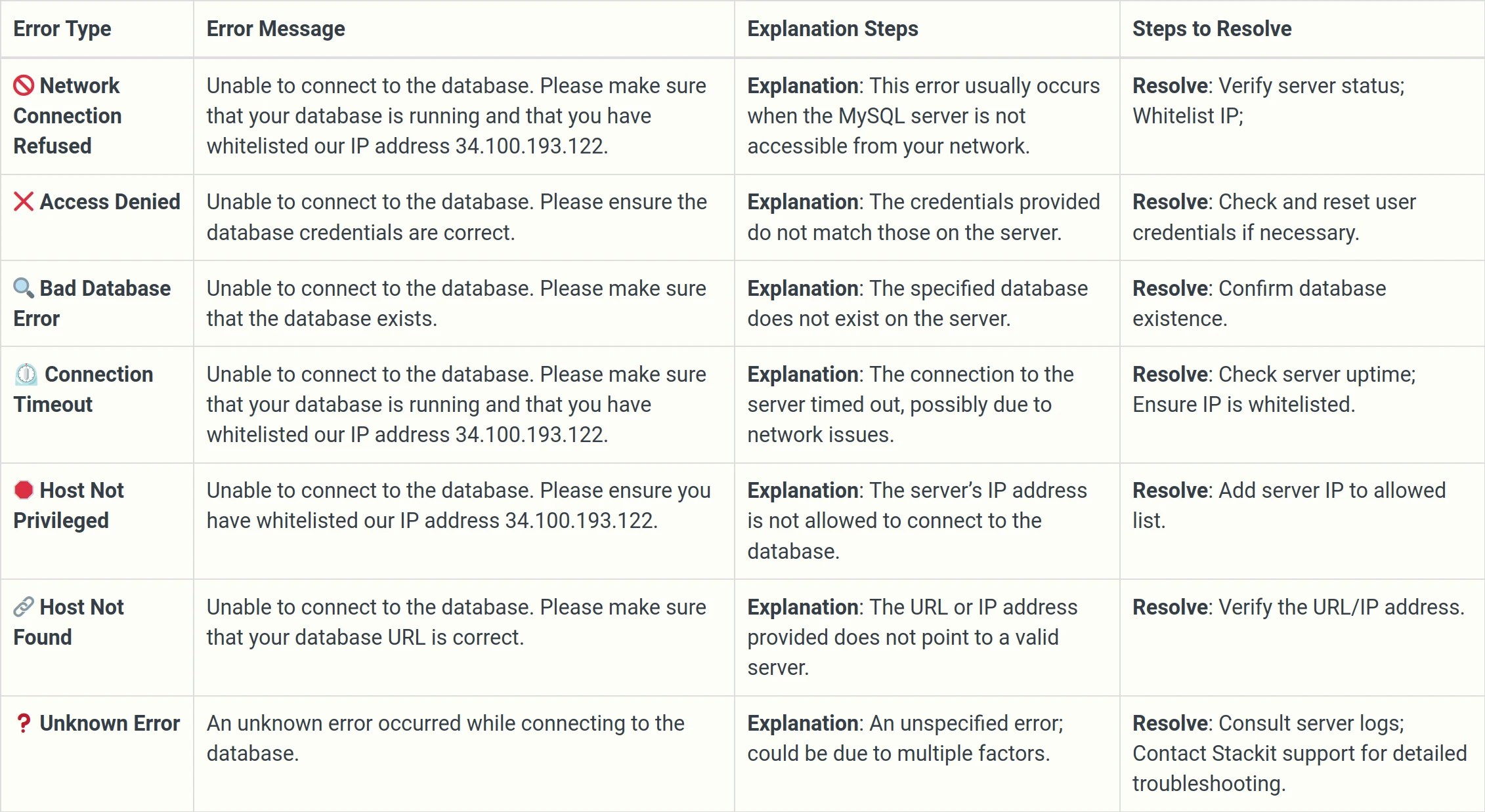 Error Message: Unable to connect to the database, Please make sure that your database is running and that you have whitelisted our IP address 34.100.193.122.