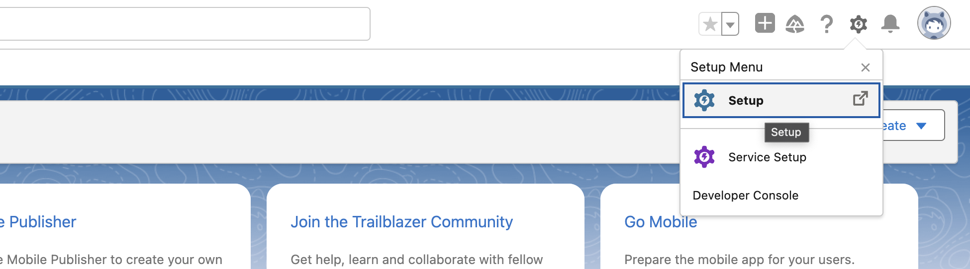 On a new web browser tab, navigate to your Salesforce account. Navigate to Setup Tab found on the top-right corner.