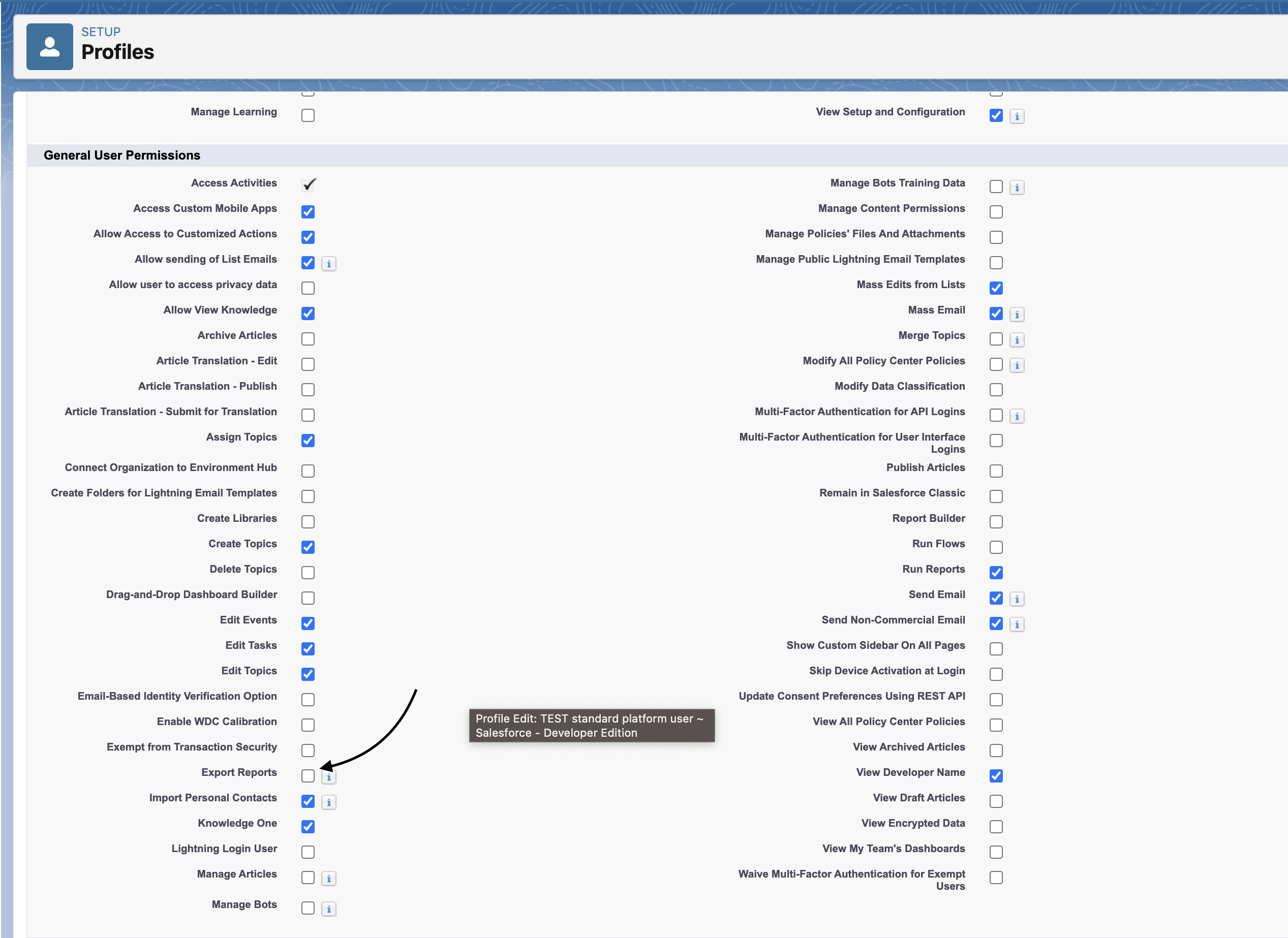 In case you are not able to enable the Export Reports option, the profile may be a Standard Profile. In that case, you will have to clone the profile and make sure Custom Profile is enabled.
