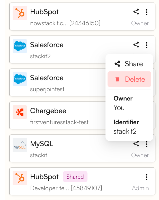 Click on the 3-dot menu of the Salesforce account you wish to delete. Click on Delete and confirm it.