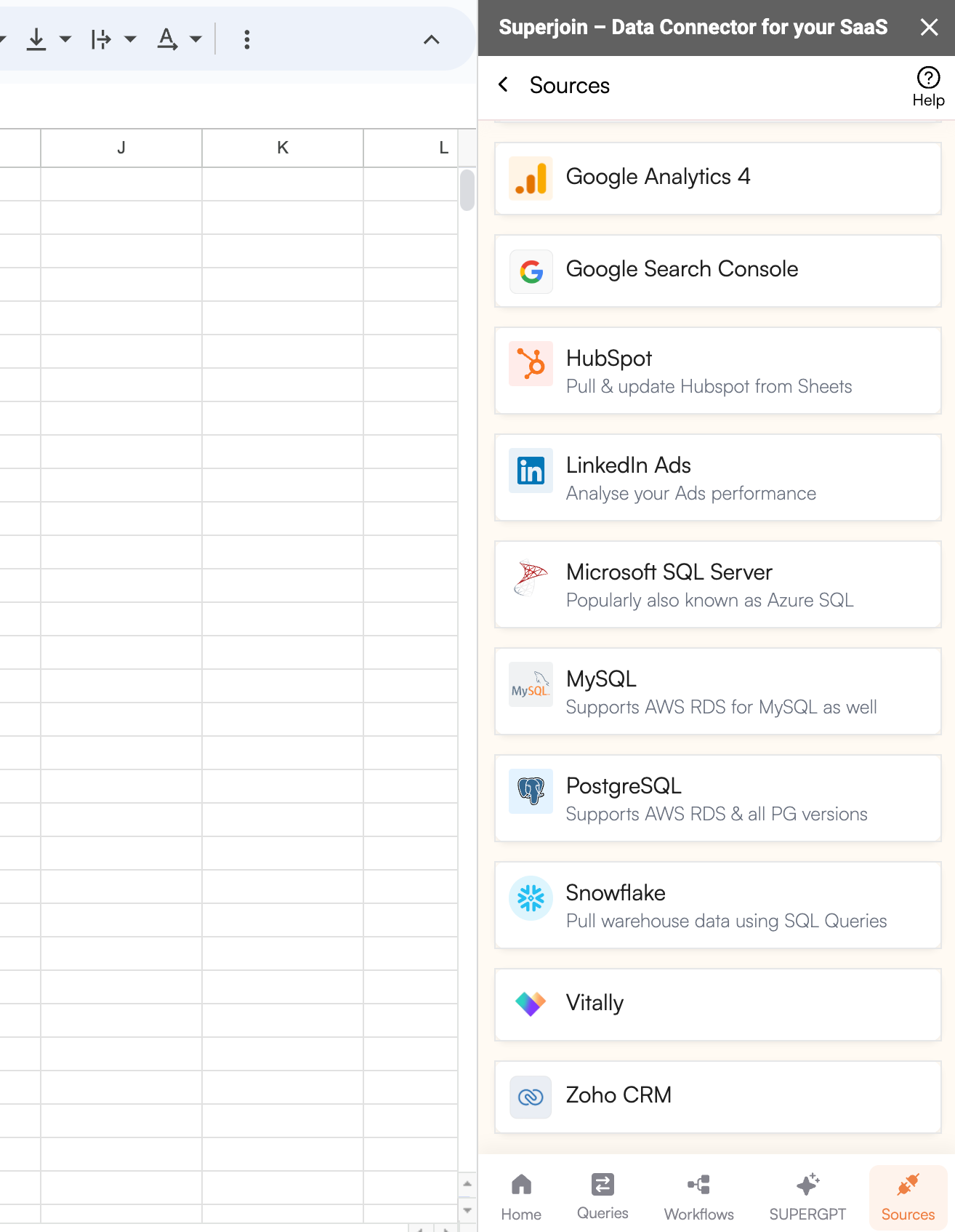 menu tab in Google Sheets. Launch Superjoin from here. You should now see Superjoin running as a side panel on the right side of your screen.