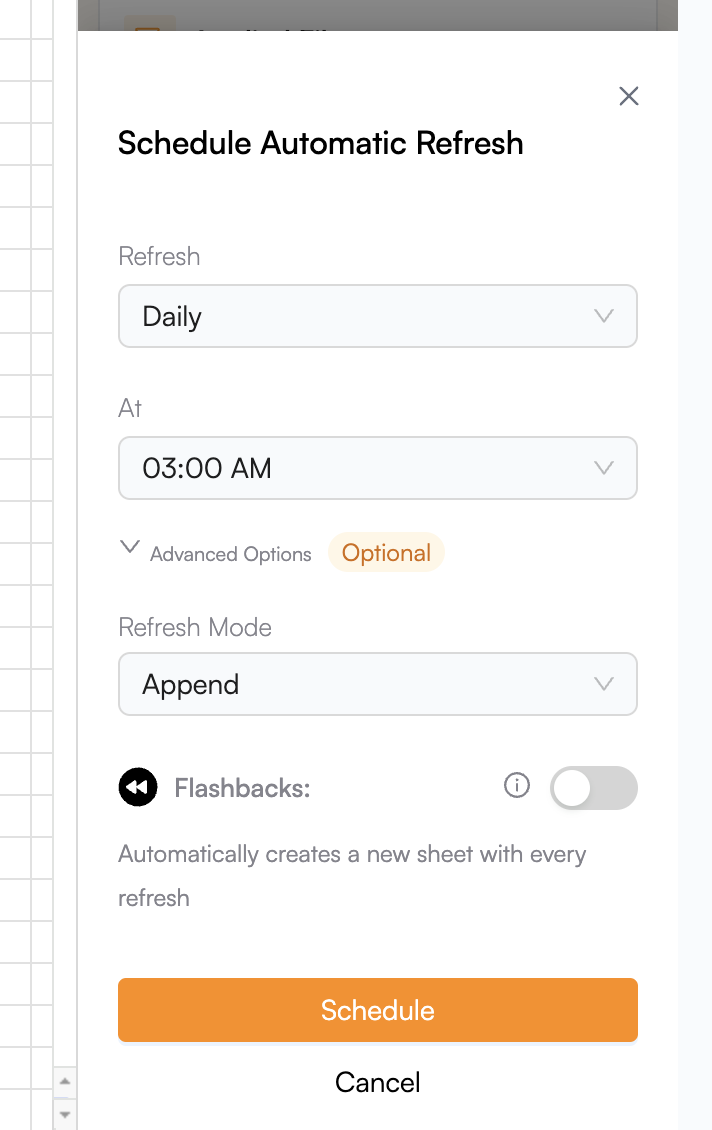 - Schedules per Sheet: You can set up to 5 refresh schedules per sheet, allowing for regular automated updates to your data without manual intervention.