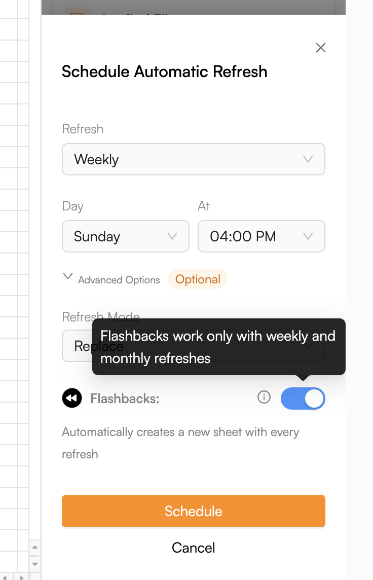 When using the Flashback feature, a new sheet will be created after each refresh. This ensures that you can maintain a historical view of your data over time. The original sheet will still be refreshed with the most up-to-date data, preserving your current working dataset while allowing you to keep track of previous versions for comparison or auditing purposes.